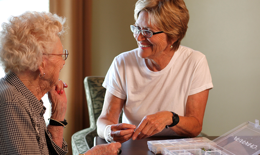 Whether a resident is experiencing nighttime wandering, repetitive questions, incontinence, or asking to “go home,” our care partners are equipped with the skills and empathy to respond gently and effectively. In addition to hands-on training, team members also complete GEM™ training, a program that uses precious gem colors to represent the changing abilities of the brain throughout different stages of dementia. This model helps us better understand each resident’s perspective and tailor care in a way that honors who they are.
